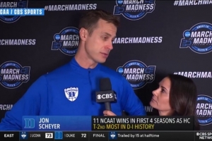 赛后,杜克大学主教练乔恩·谢耶接受了记者采访。谈到被绝杀出局,他说道:“我无言以对。我只知道,这些球员不应得到这样的结局,他们整个赛季的表现都非常出色,他们不应该这样出局。我没什么可说的。”
