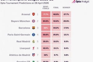 OPTA对各队晋级概率进行了预测,阿森纳晋级概率高达77.7%,拜仁为64.5%,巴萨为68%,而巴黎圣日耳曼则为59.6%。在这样的情况下,皇马、利物浦、马竞和葡萄牙体育是不被看好的一方。