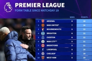 德转统计了同期(自第19轮以来)英超各队的积分情况,热刺是唯一没有取胜过的球队,而且球队同期积分排在英超20支球队的最后一位。